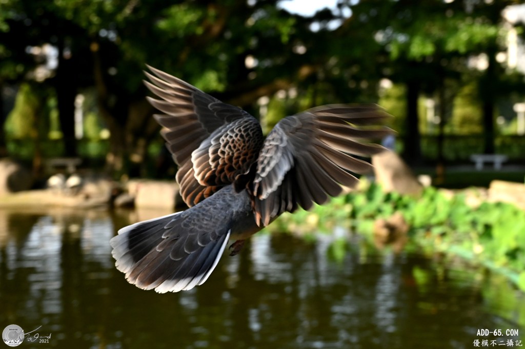 20201118那一天經過中和四號公園,剛好拍到這隻野鴿,它由花台上跳下時,兩翅高舉著地,剛好按下快門(ISO-250,F/2.8,1/8000秒,EV+0.3),沒多久,它就往右側飛走,繞過筆者右前側,就順便快速再拍一張飛行照片(ISO-180,F/2.8,1/8000秒,EV+0.3)。這兩張照片參數,唯一差異是ISO值不同,筆者當時有設定成自動ISO,S模式固定快門值。