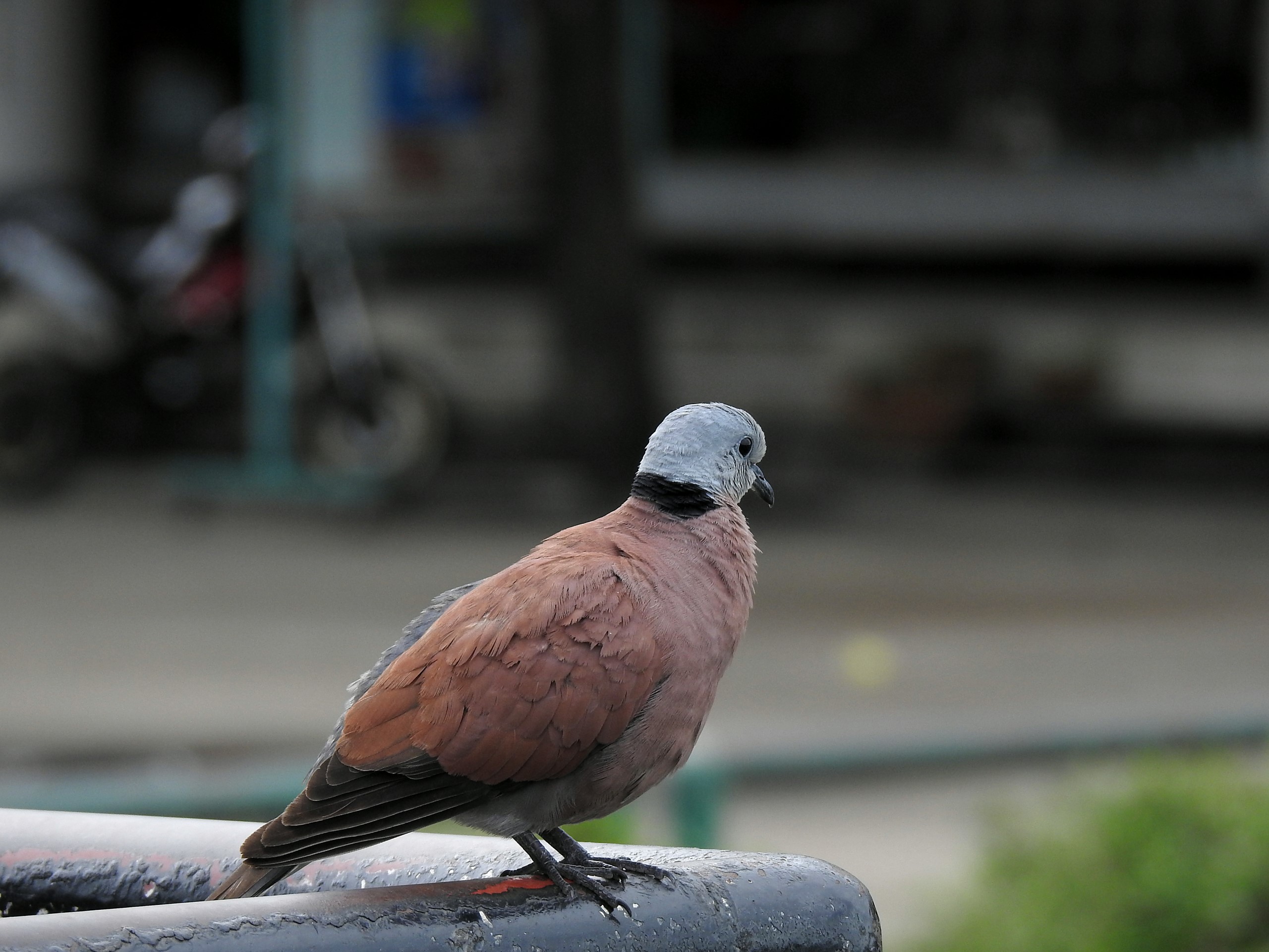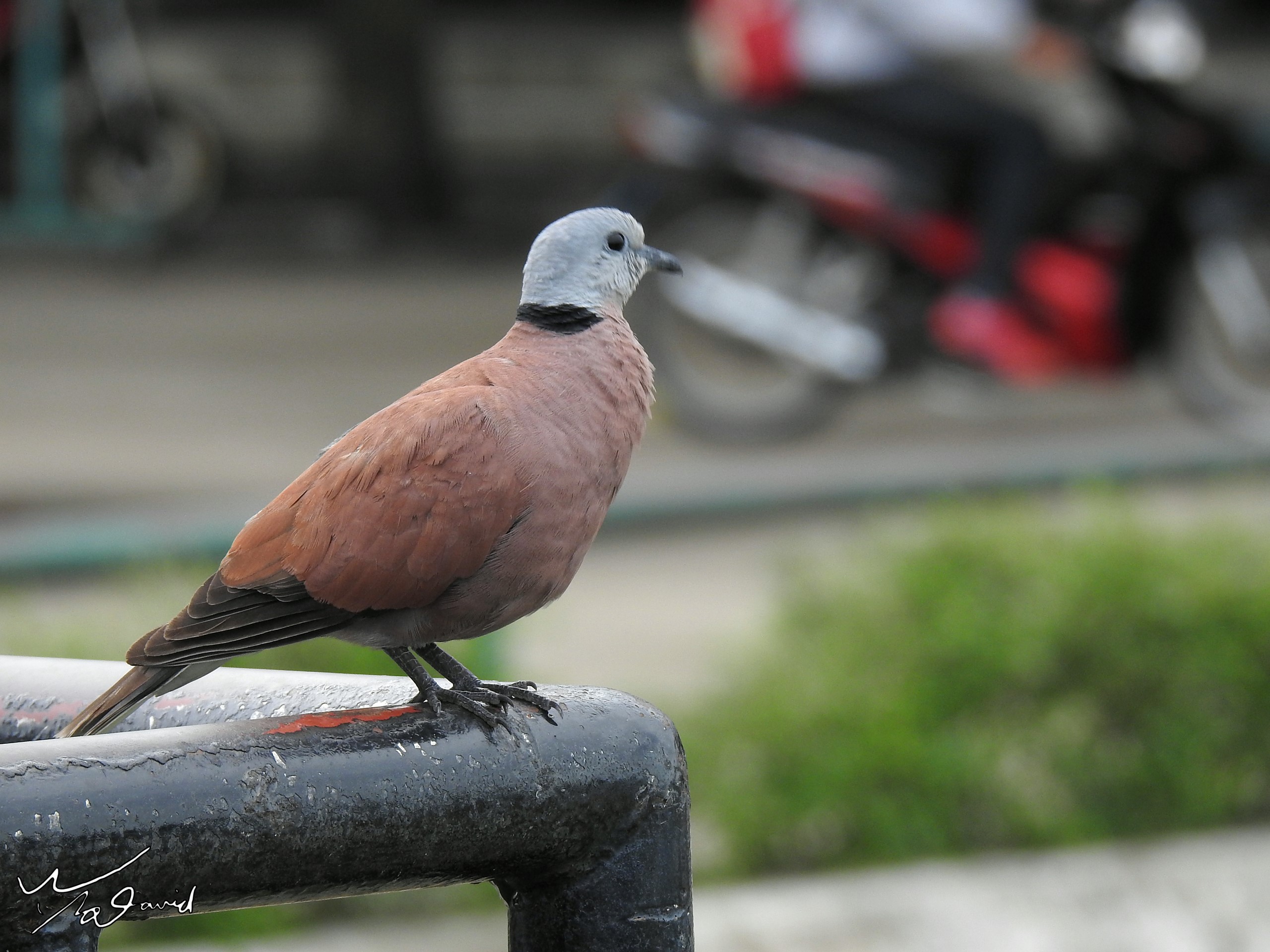 同一天在桂河大橋旁也拍到一隻火斑鳩(紅鳩),很可愛的模樣,毛色和一般的鳩不一樣,頭部灰色,身體是淡紅磚色。