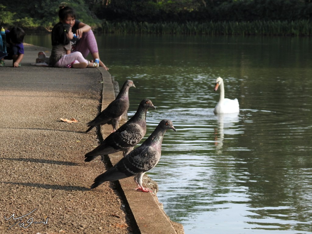 20170914在新加坡植物園裡拍攝,三隻野鴿站在湖邊,兩隻同時一起轉頭,用P900在遠處拍下這一張照片,湖中有兩隻白天鵝(另一隻在湖中未入鏡)。