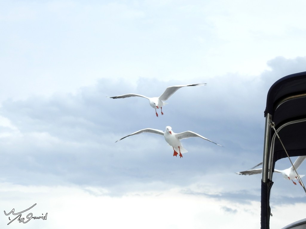 下圖兩隻飛行中的海鷗,正觀察船上的動態,隨時要搶食的準備動作,顯然長久餵食的循環,已經讓它們養成一種慣性行為,會不會影響原本的獵食呢?話說餵食野生動物是比較不適當的行為,但常見的為了觀光發展,而適應性地開放某些定點可以進行餵食,似乎已經成為全球各地的一種默契,是好是壞呢?就讓我們繼續看下去囉!