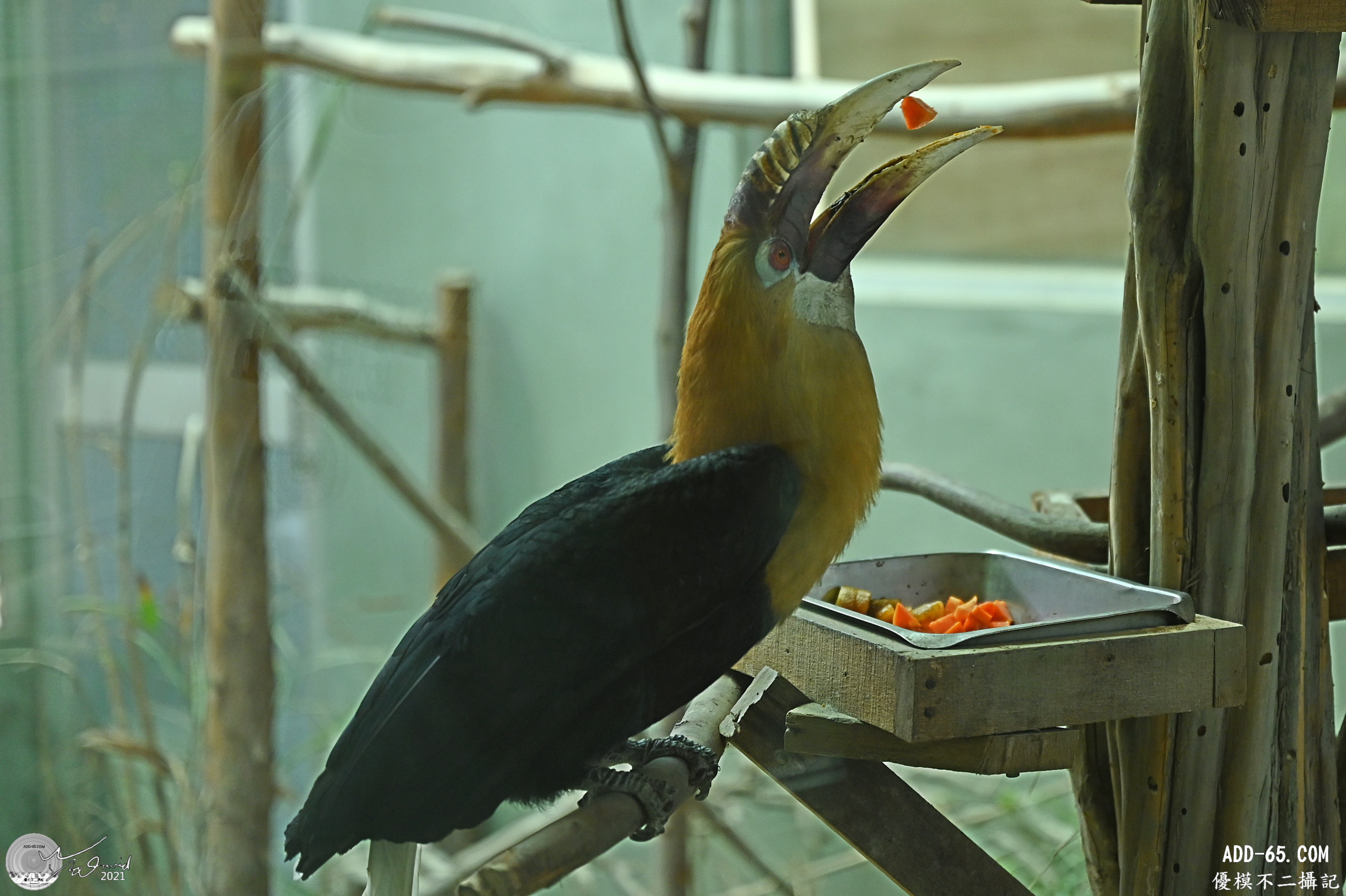 今年四月在台南頑皮世界也拍到幾種鳥,下面兩種較少見的種類,左圖是藍喉皺盔犀鳥,正在吃水果,它先用啄由盆裡刁著往上抛,張開鳥啄接住空中的水果塊,很好玩。右圖是大嘴巨鳥,某種品牌的代表。這兩種外形較特別,也很漂亮,還有拍到其它物種,未來再分享介紹。
