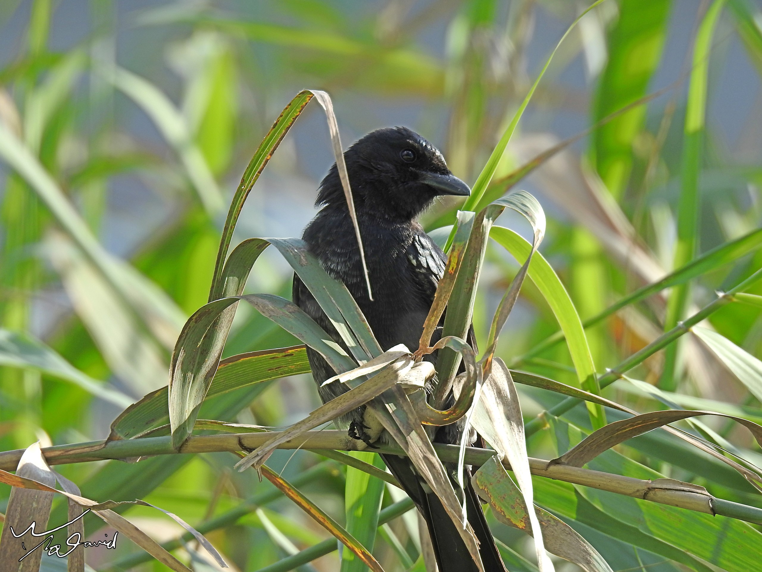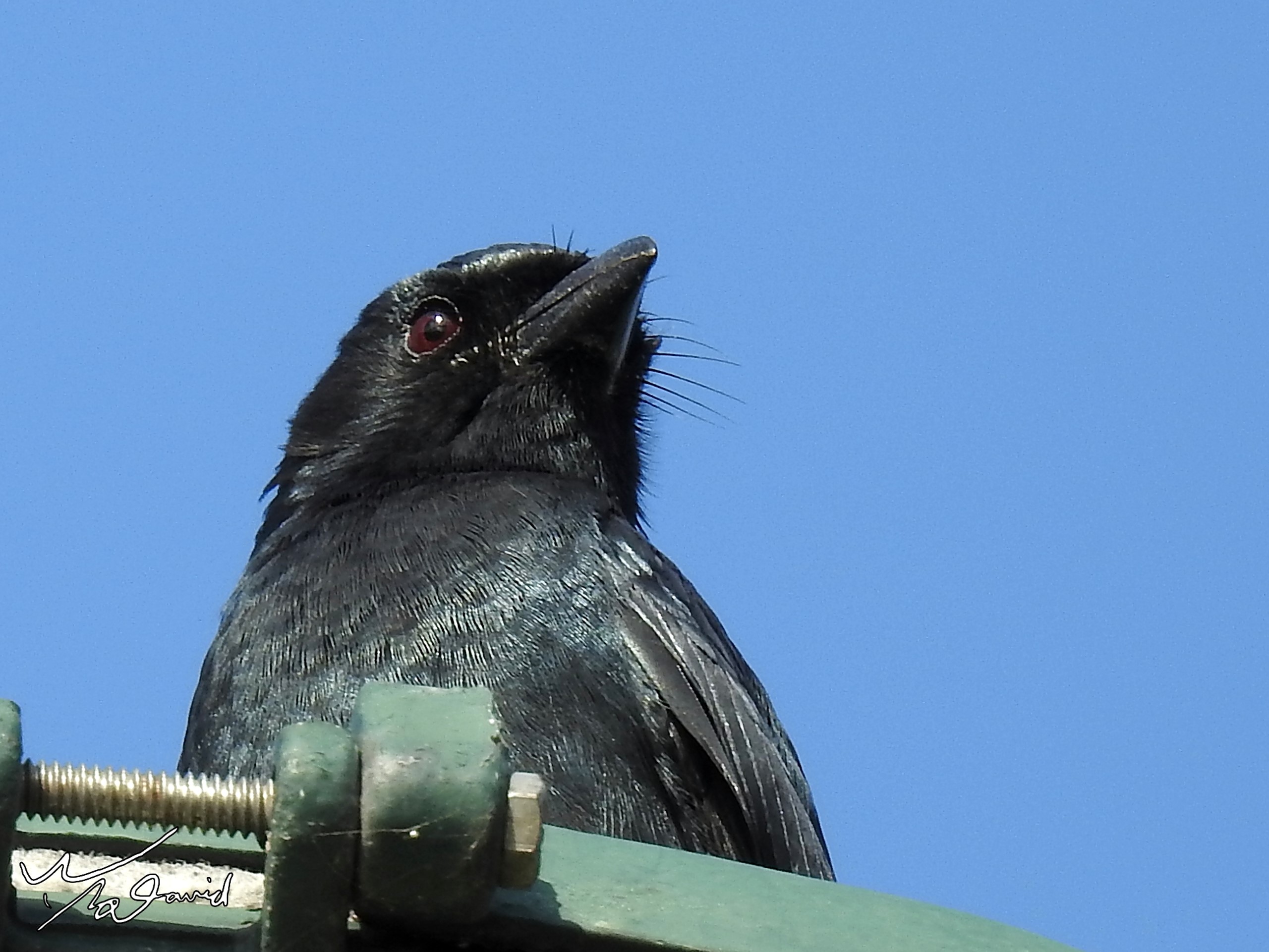 在台灣境內也拍過一些野鳥,下圖是在基隆河圓山段右岸拍到全黑毛色的大卷尾(台灣亞種),它先在河道旁的步道路燈上休息,用P900長焦段拍到它頭部特寫,之後飛到河邊的芒草裡,再拍一張。