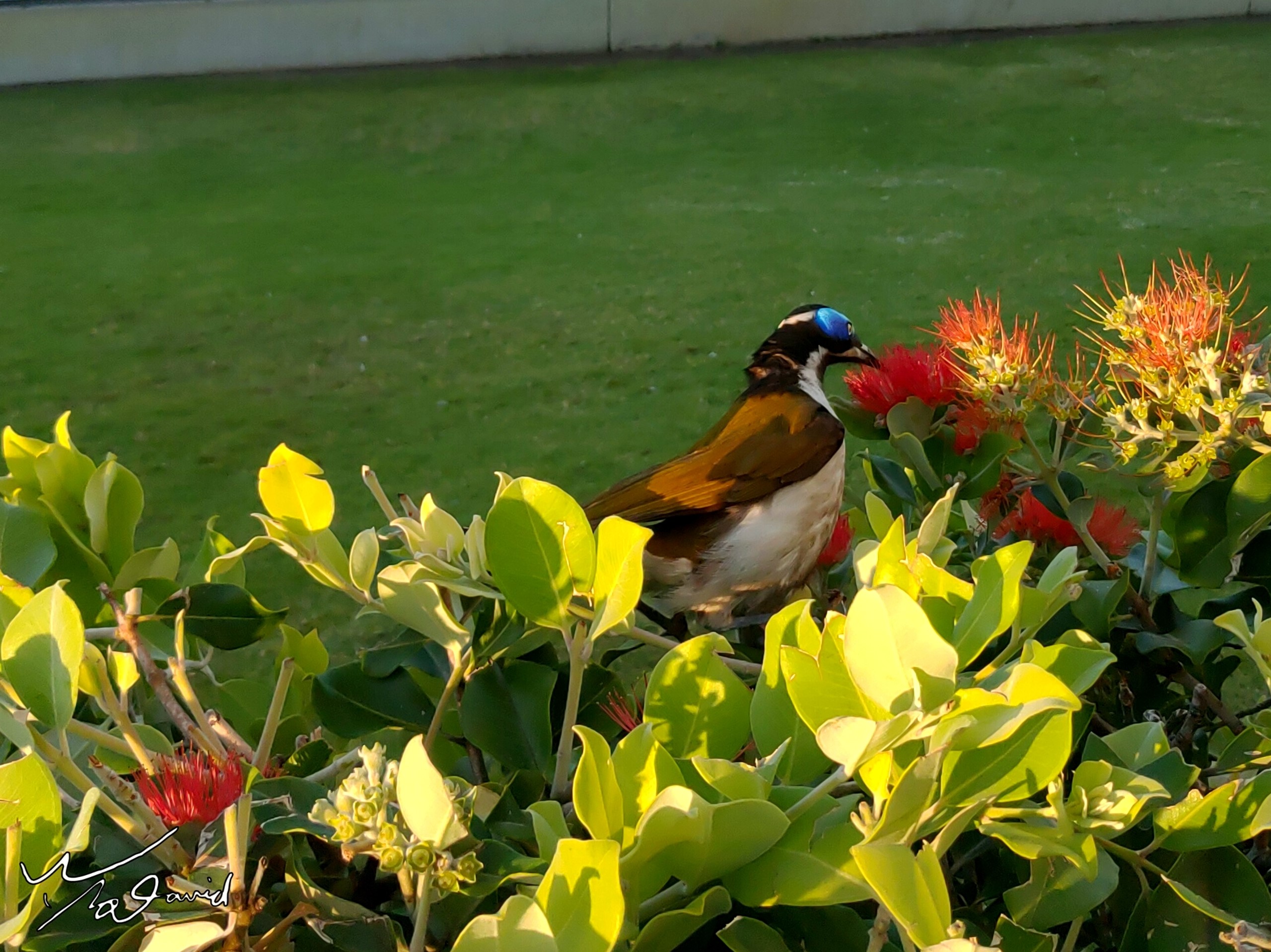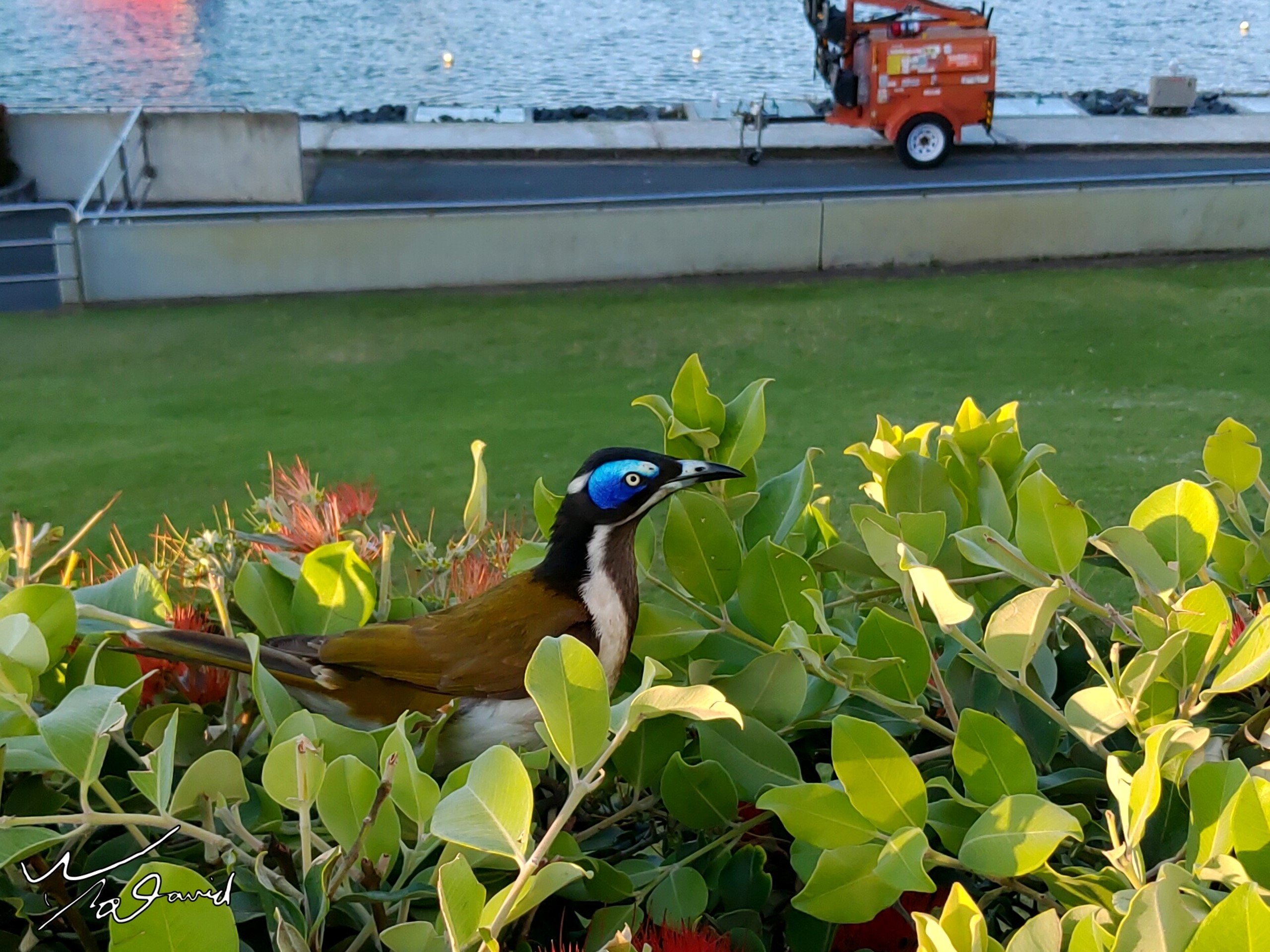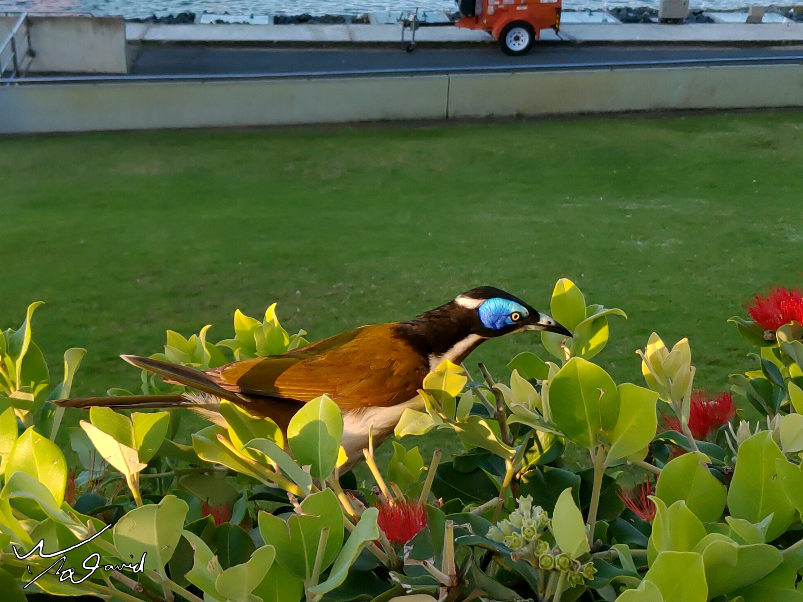 第三種鳥的羽色真漂亮,那一天在黃金海岸海洋世界玩了一天,準備集合一起去園區餐廳吃晚餐,突然看到紐西蘭聖誔樹上有一隻漂亮的鳥,那時相機已收進包包裡,只好拿出手機快拍四張。回來後,開始在網路上比對,還好,它的特徵很特別,容易辨識,很快就找到答案:藍臉吸蜜鳥。