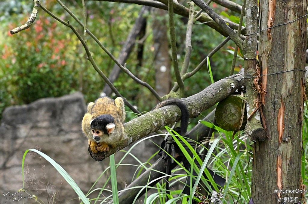 台北木柵動物園是筆者最常前往的拍攝動物的地點,小巧靈活,又很好動的黑冠松鼠猴,尾巴非常長,這一張剛好它趴在枝幹上,可以拍到前腳,耳朵不大,帶著淺色的毛色,在黑色頭部很搶眼。