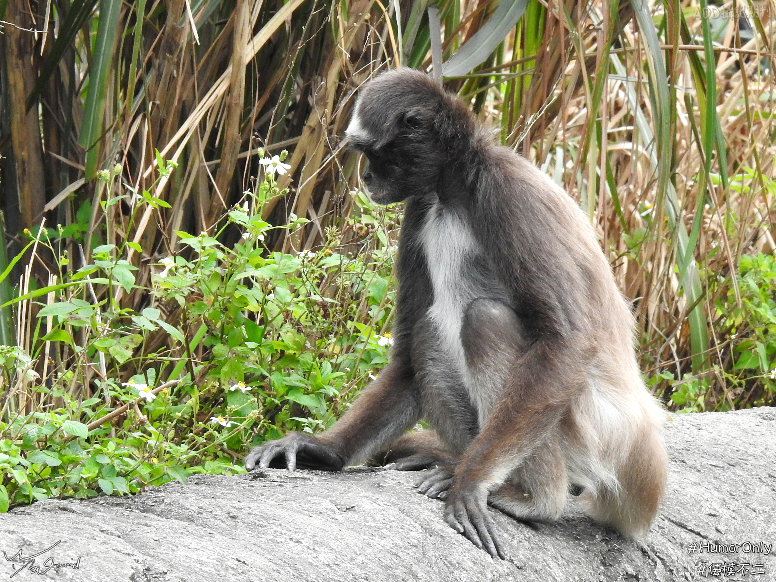 棕蜘蛛猴最大特色在頭額有個三角型的白色毛,加上手部大姆指已退化,只剩四支手指,這個角度剛好拍到四支手指,可惜它可能害羞吧,看鏡頭就把頭往右邊轉去,沒拍到臉部。