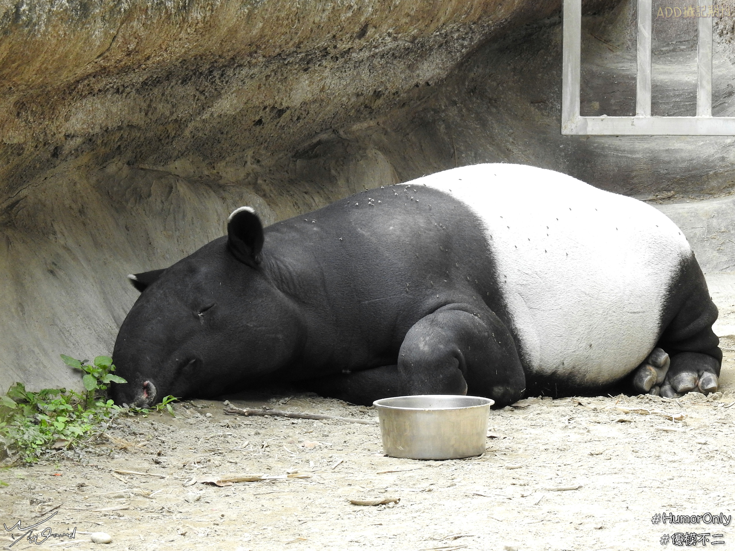 馬來獏一付卡通明星般的模樣,黑白兩色的體色,加上長長的鼻子,配著肥肥身體和短腿,就是逗趣的模樣。拍攝那天,它剛好在睡午覺,睡得正香甜,但許多蒼蠅不斷停在它身上,可以看到自然反應的皮膚抖動的動作。