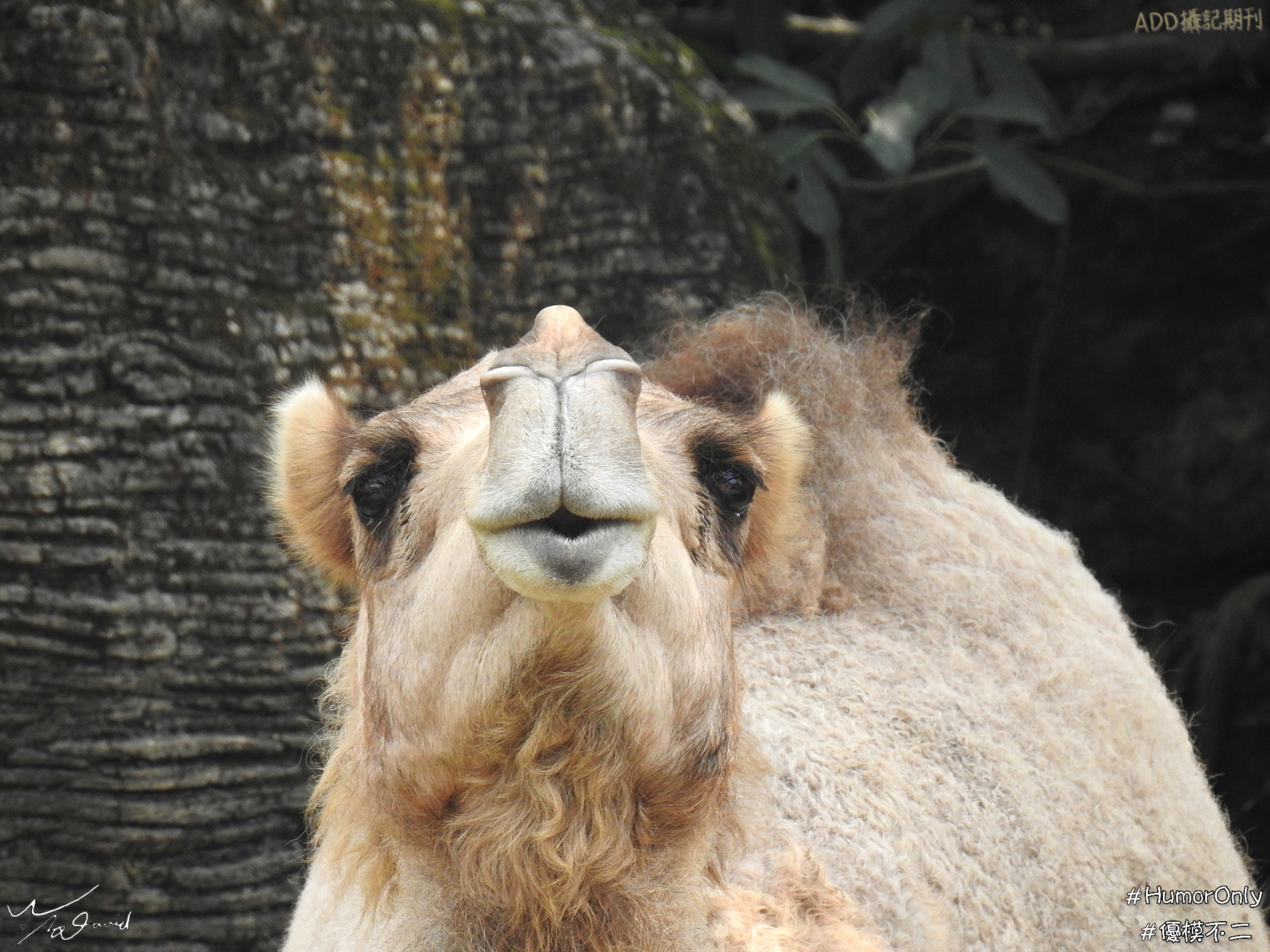 單峰駱駝的眼神非常憂鬱,從正面拍它,那種感覺更加濃厚,嘴巴微張像是要打招呼,雖然感到眼神憂鬱,但整個臉部表情還真可愛。