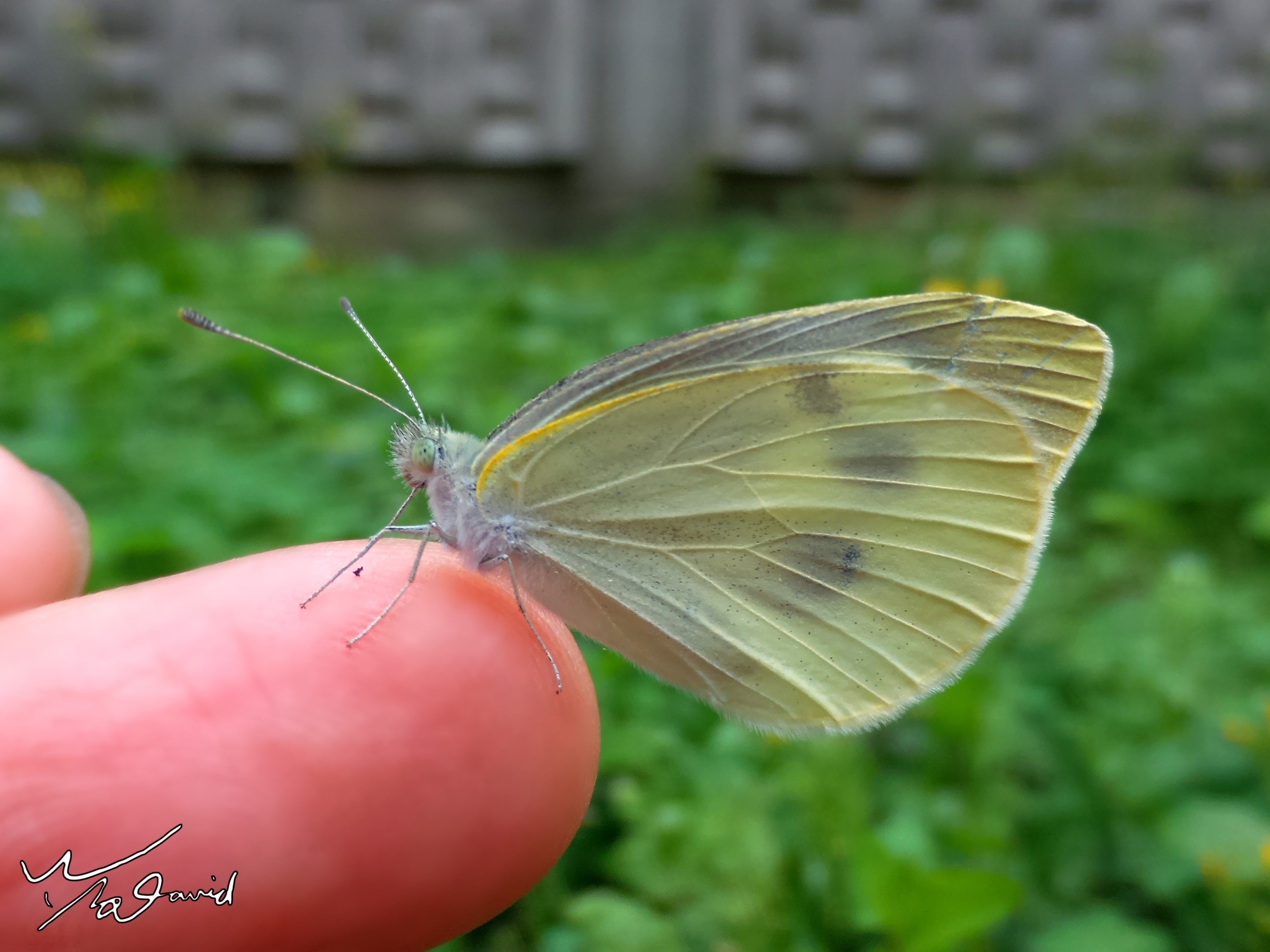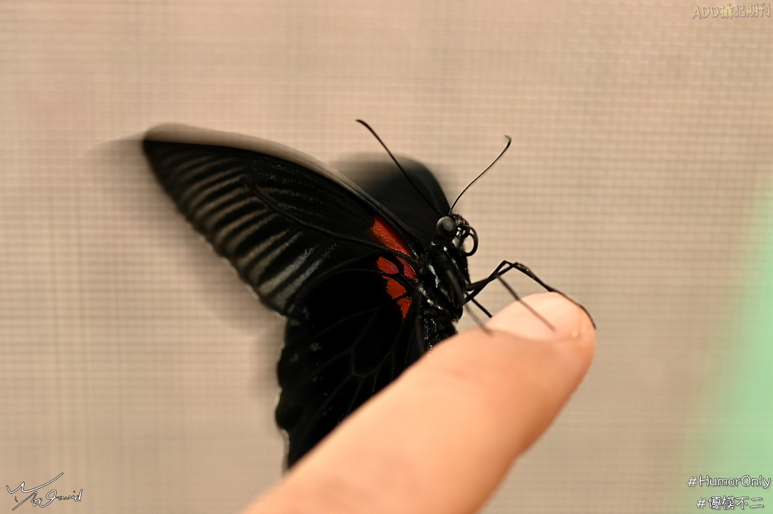 下面兩圖是在室外拍攝時,遇到蝴蝶靠近筆者,伸手過去竟然也會爬上筆者的手,不管是手機或相機,快快拍照留念。左圖是在劍湖山世界遊樂園裡,遇到這隻大鳳蝶,右前翅有點破損,但還能飛行,可能是太累了(那天很熱),停在地上,筆者怕它被遊客踩到,伸手過去它自動爬上來,拍了照,看了一下它的樣態,過沒多久就起飛。右圖則是在板橋農村公園外拍時,在草地上看到這隻白粉蝶,慢慢靠近它,先拍了幾張特寫照片後,左手一伸,竟然也爬上手來了,就用手機快拍一張,一下子就飛走了。為什麼野地的蝴蝶會爬上手?可能是筆者有養殖蝴蝶,身上有粉味(鱗粉)吧!