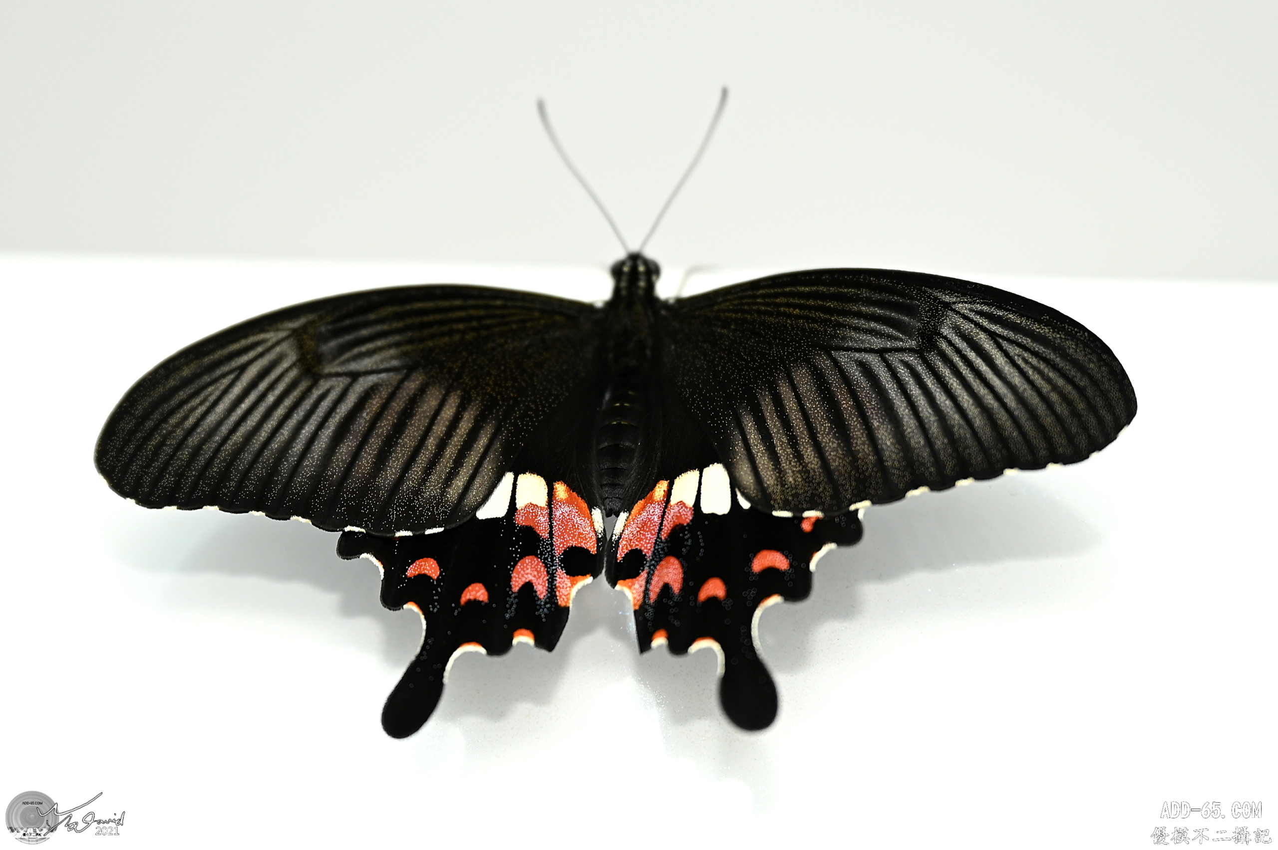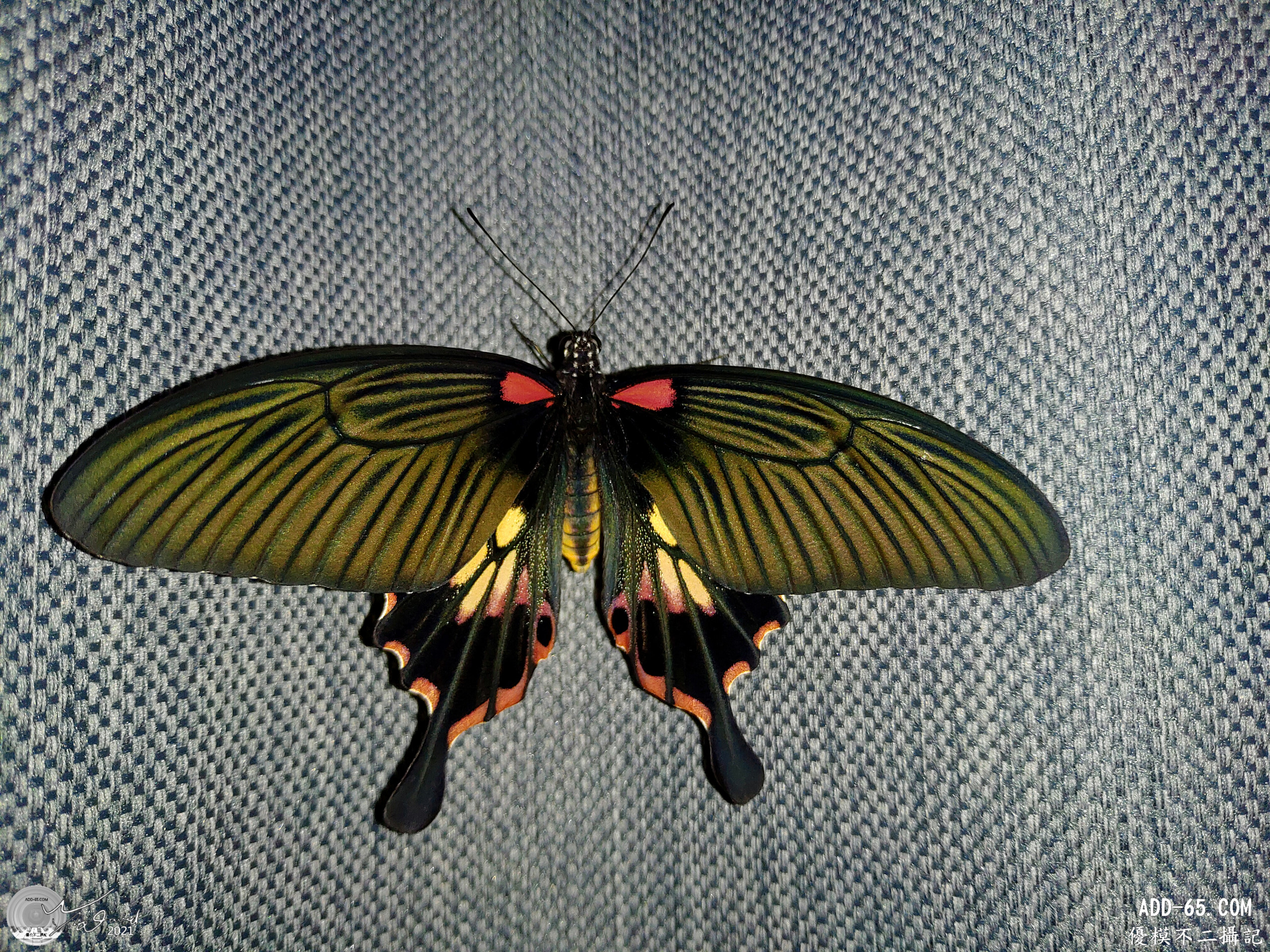 破蛹後,當它認為可以飛行時,會在室內亂飛一通,就像小朋友學走路一樣,飛得不是很平穩,但隔一下子就會找個地點休息,這時候也是拍攝的好機會(下兩圖)。左圖和主圖是同一隻玉帶鳳蝶,練飛後停在冷氣室內機盒上,剛好是白底,拍起來很好看。右圖則是大鳳蝶(雌)練飛後,停在窗簾上休息,拿起手機拍了一張,大鳳蝶雌蝶有三種外型,這一型較少見,非常漂亮。