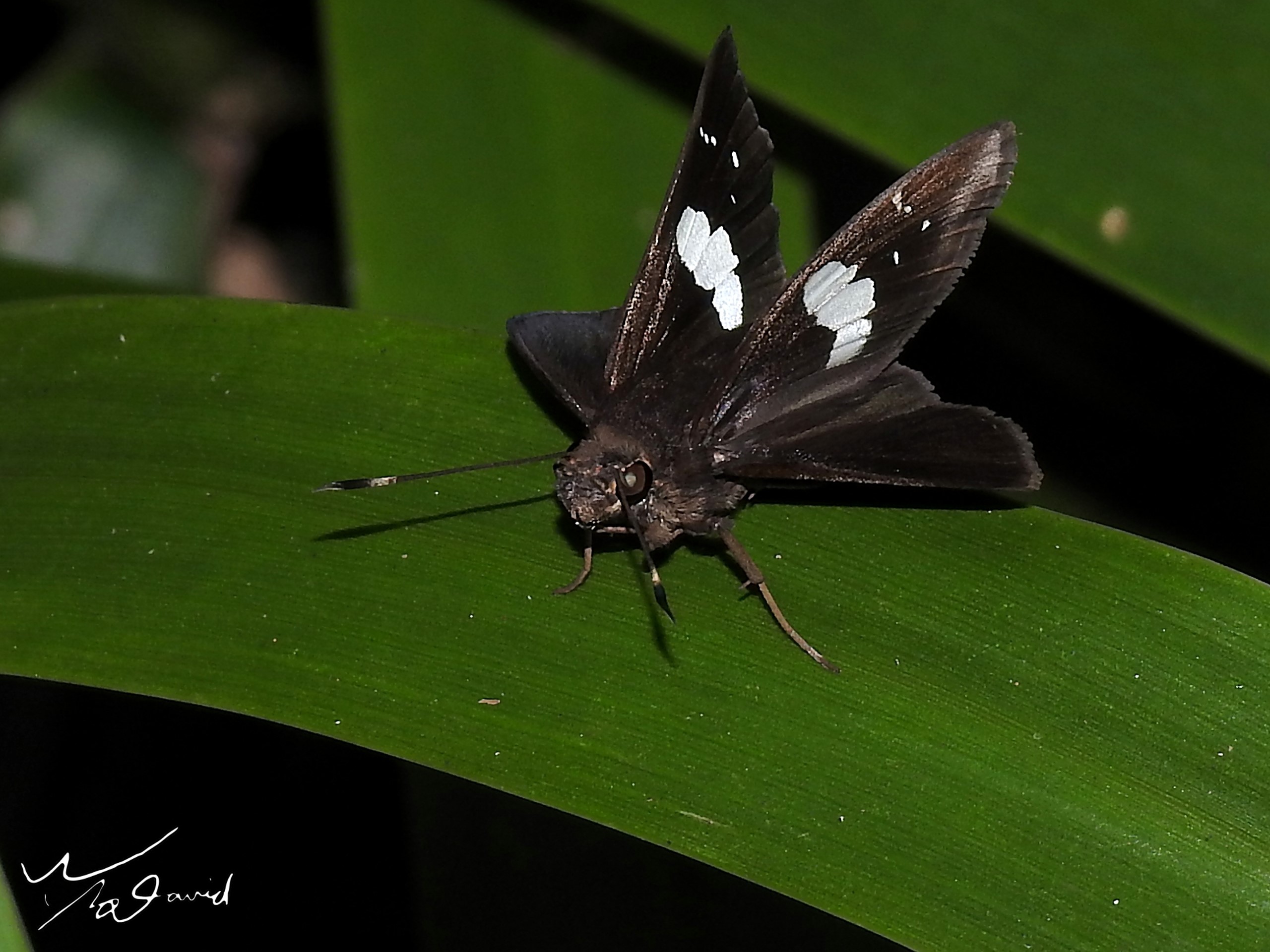 接下來兩張照片,一蝶一蛾,筆者較少拍攝蛾,對蛾的習性比較沒有鳳蝶清楚,這兩張也算是巧遇,左圖在新店天山公園拍攝植物時,發現這隻袖弄蝶,前翅立起好像一台戰鬥機,因為在樹林裡光線較暗,破例開了閃光燈拍攝。右圖則是在社區採集柑橘葉回家給鳳蝶幼蟲時,看到這隻野螟蛾的花紋很漂亮,就用手機拍了這張照片。