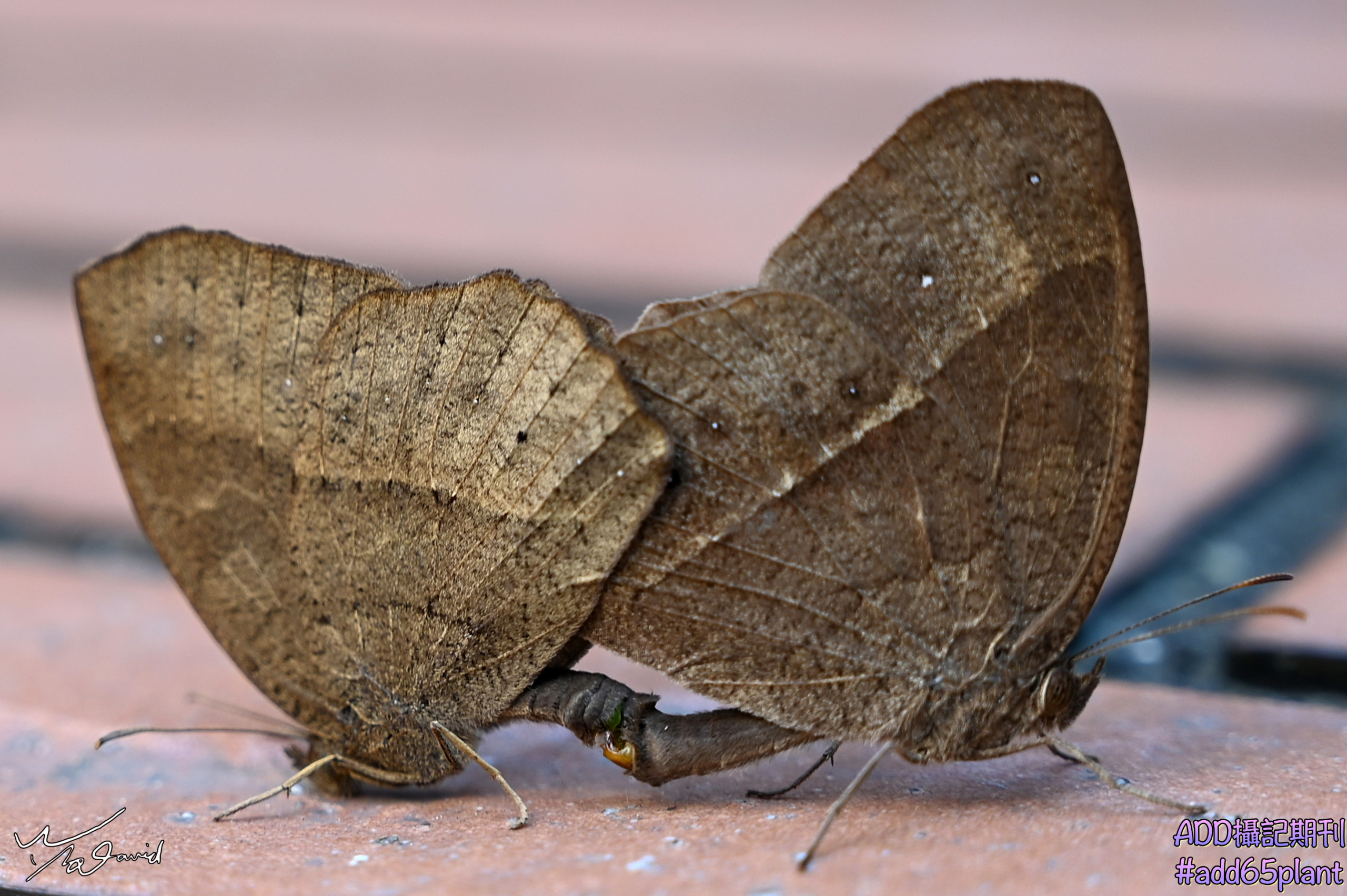20190312那一天,拿著新買相機在樓下花園練手感,遇到這對切翅眉眼蝶在在交尾,小心地接近它們,用70mm焦段拍攝,雖然沒有非常靠近,拍了幾張照片,也順便錄影記錄。但它們很敏感,發現有鏡頭對著它們,就一起飛走,往旁邊花圃飛去,停在花圃旁,就再拍個幾張照片。