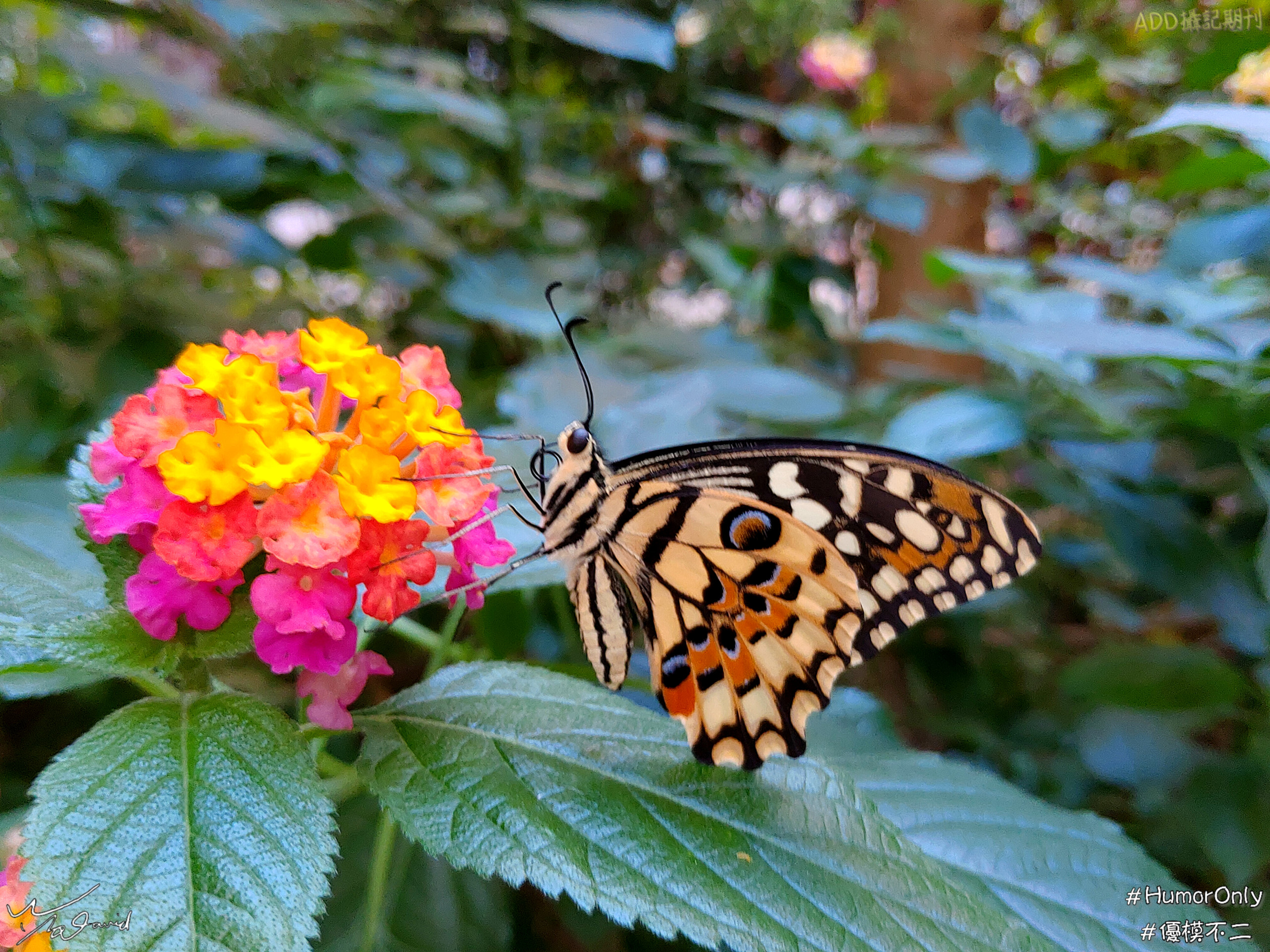 在它羽化後休息夠了,就會帶到樓下花園放飛(下兩圖),通常筆者會把它放在花朵上,趁機再多拍幾張照片,最後,它如果覺得可以飛行,就會自己飛走。左圖停在白色杜鵑花上的無尾鳳蝶(雄),右圖則是停在馬纓丹休息的無尾鳳蝶(雌),停在花朵上拍攝,有另一種風味,有機會再分享其它放飛時的記錄照片。