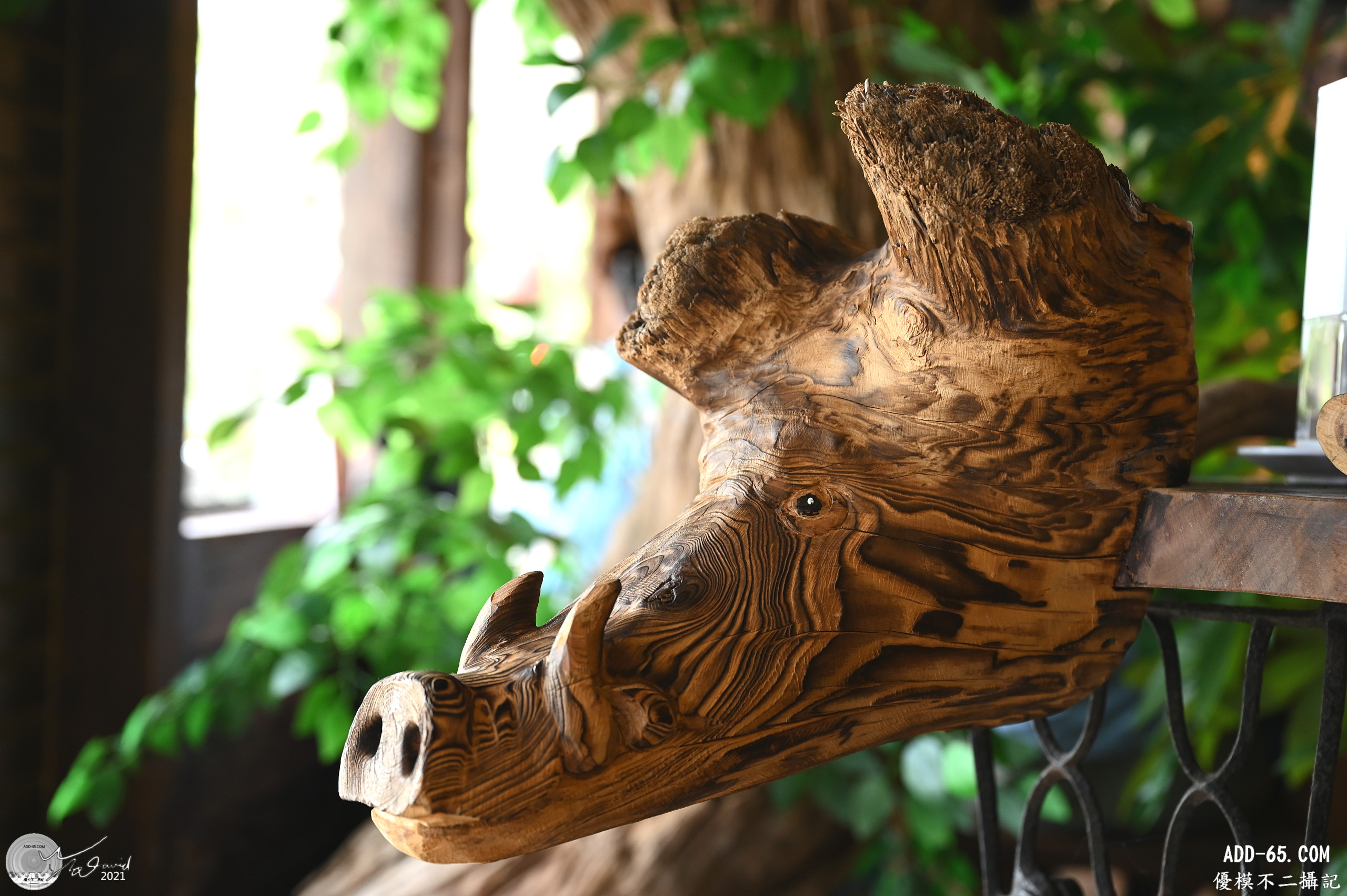 室內也有一些木製藝術品,下面兩張是比較有特色的藝品。山豬頭連著一個平台,放著酒精和登記本,筆者只為山豬頭拍個特寫,太可愛了。櫃台區和用餐區用一個大大的蝴蝶造型當屏風,很有創意,室內牆面也有一些小的藝品展示,也有老式電話機的展示,有機會可以去看看。