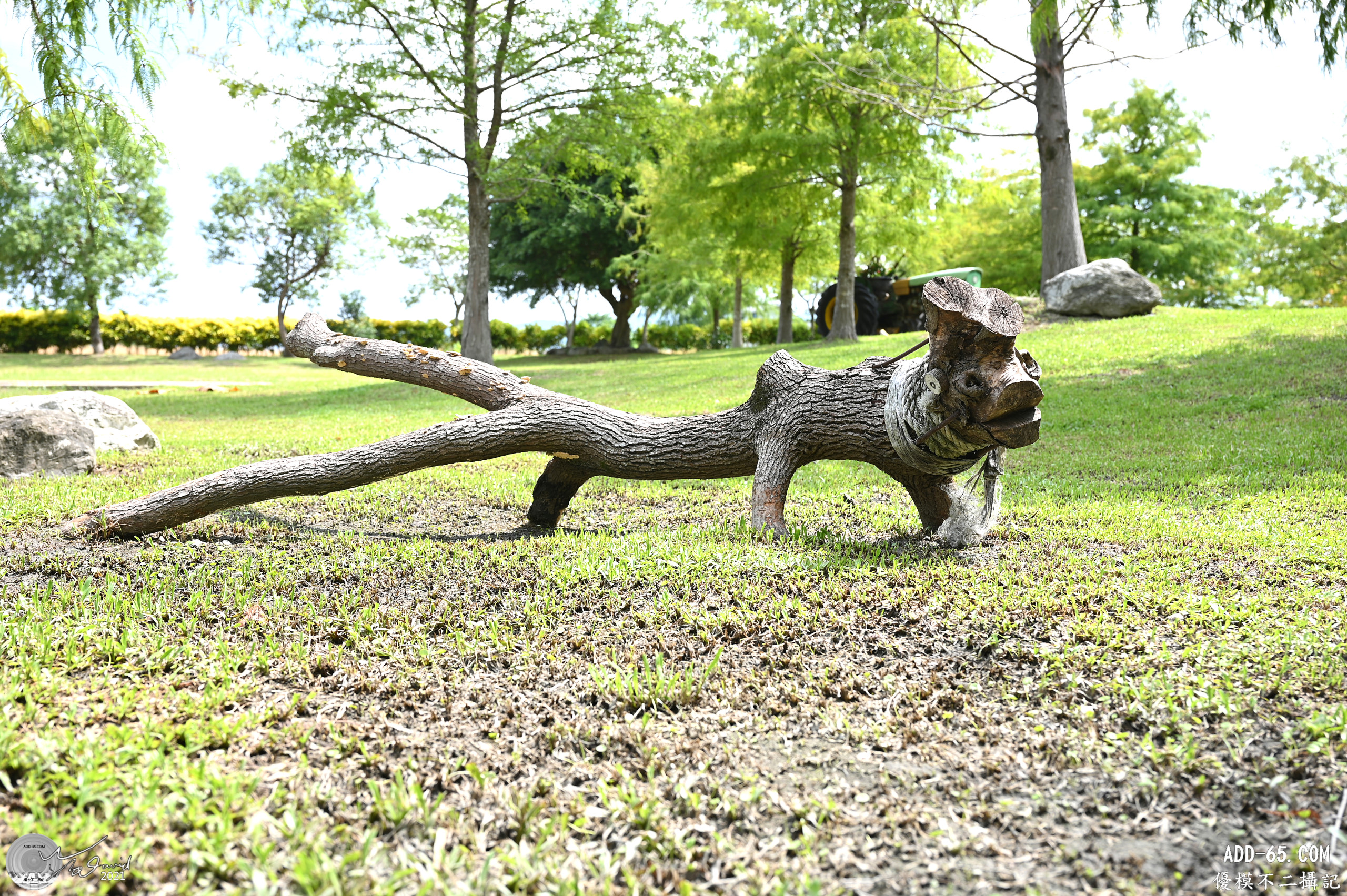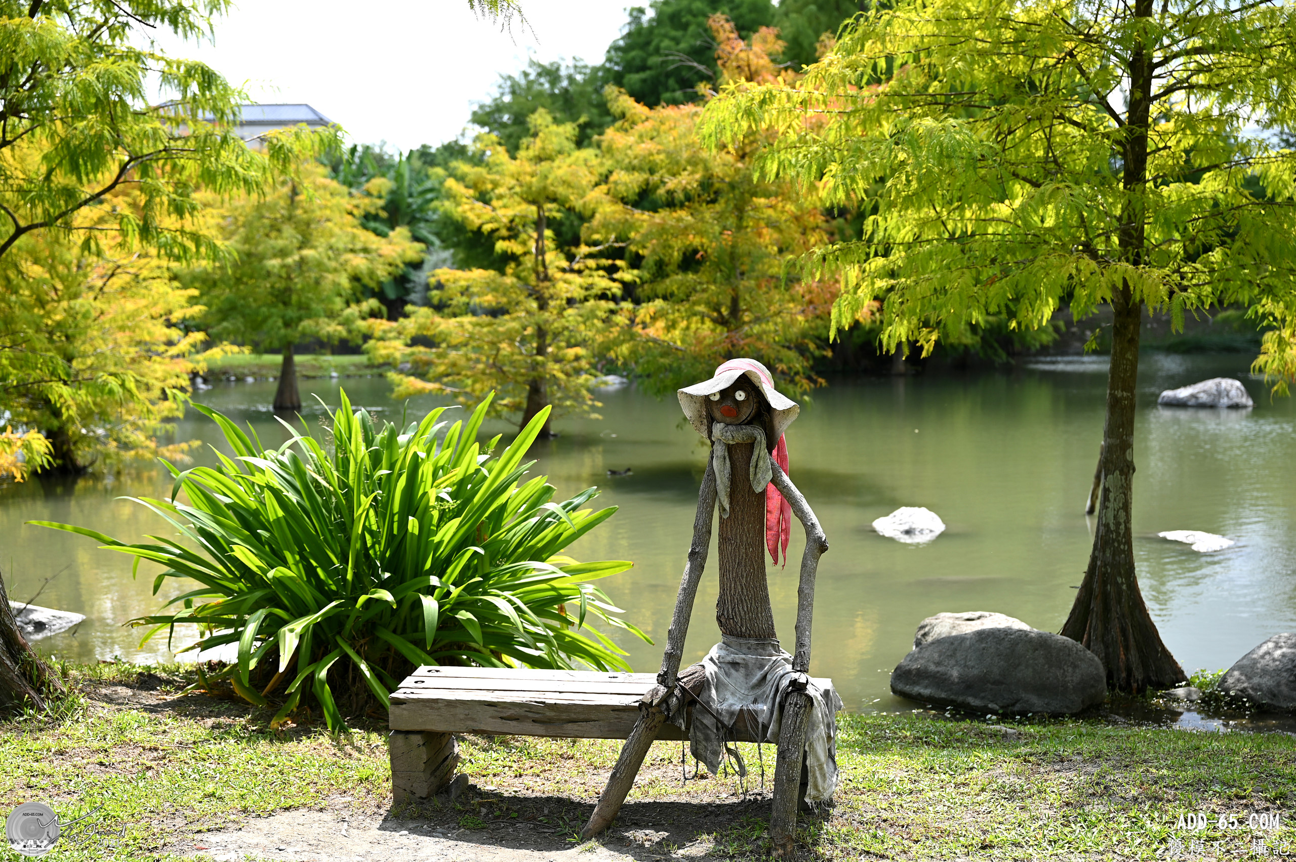 庭園裡除了落羽松之外,最大特色是木頭的藝術裝置品,下面兩圖是在庭園中拍攝,應該不難看出是什麼意境吧!