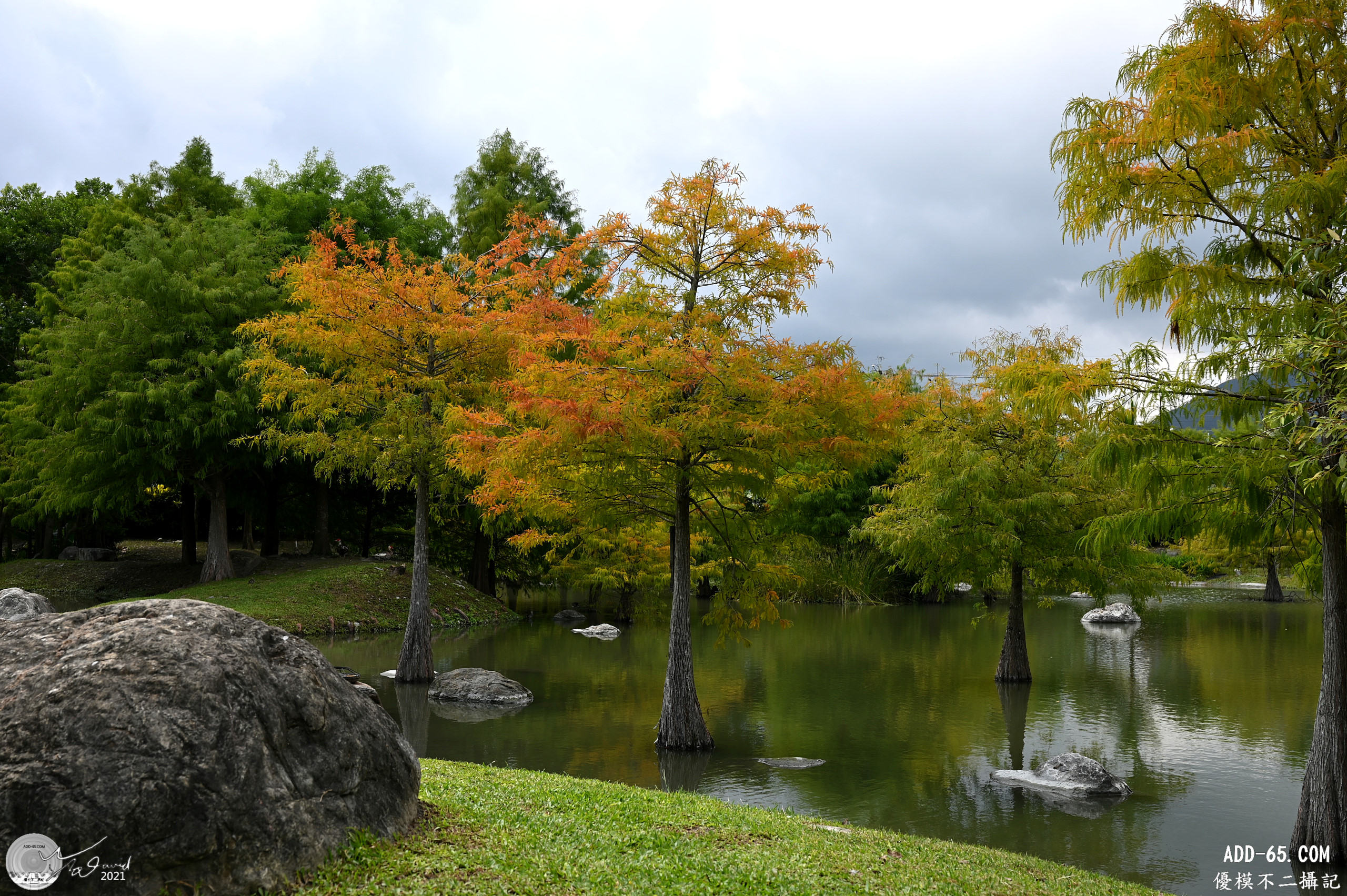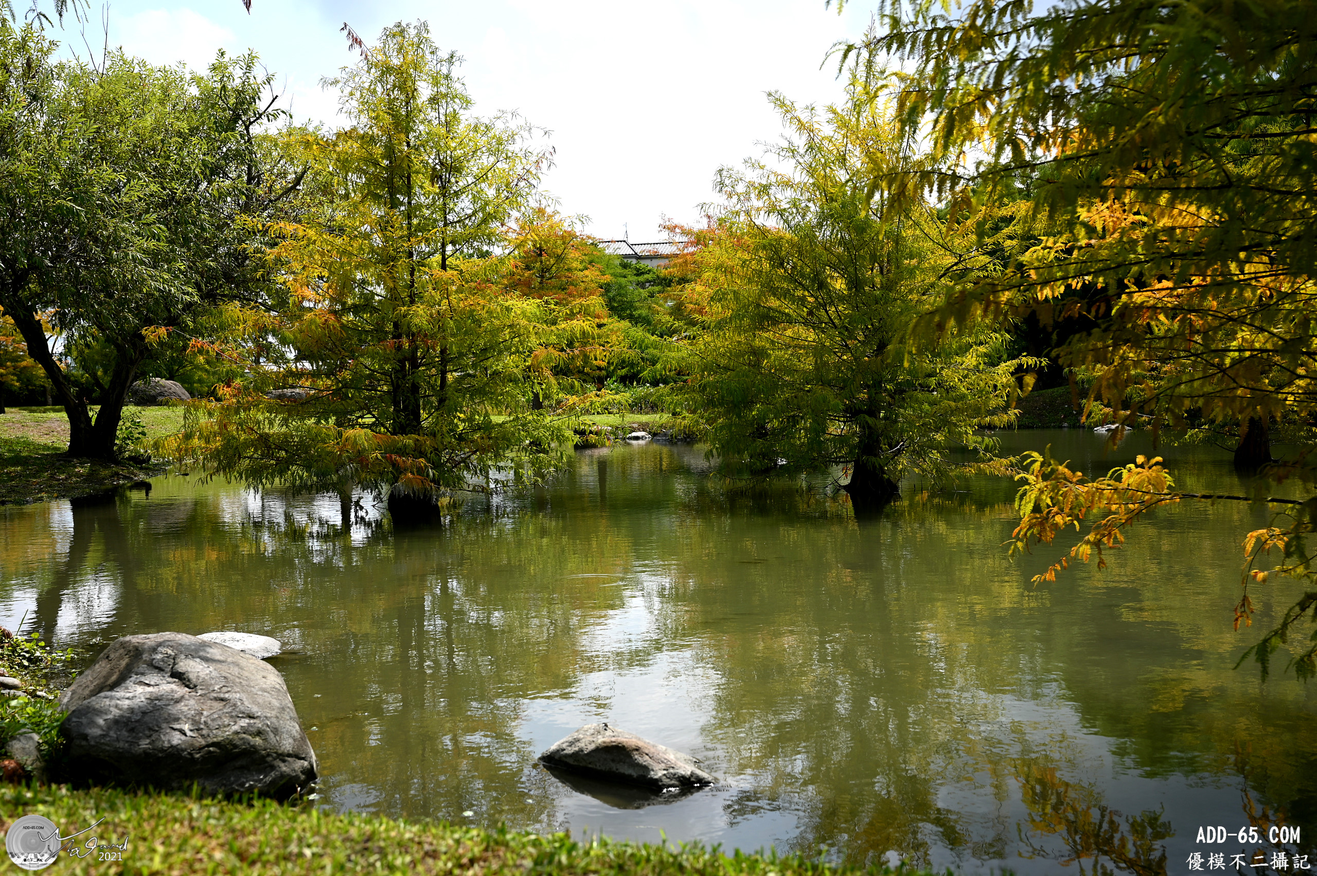 挑選三張不同角度拍攝落羽松的照片和大家分享,微風偶爾會停止,所以有一張的倒影還不錯,那一天的天空雲層還蠻厚實,少了藍天比較可惜。入秋後,落羽松的葉片會開始轉黃變紅,11月的時段,應該會更紅。葉片變色過程,色彩占比不同,各有特色。