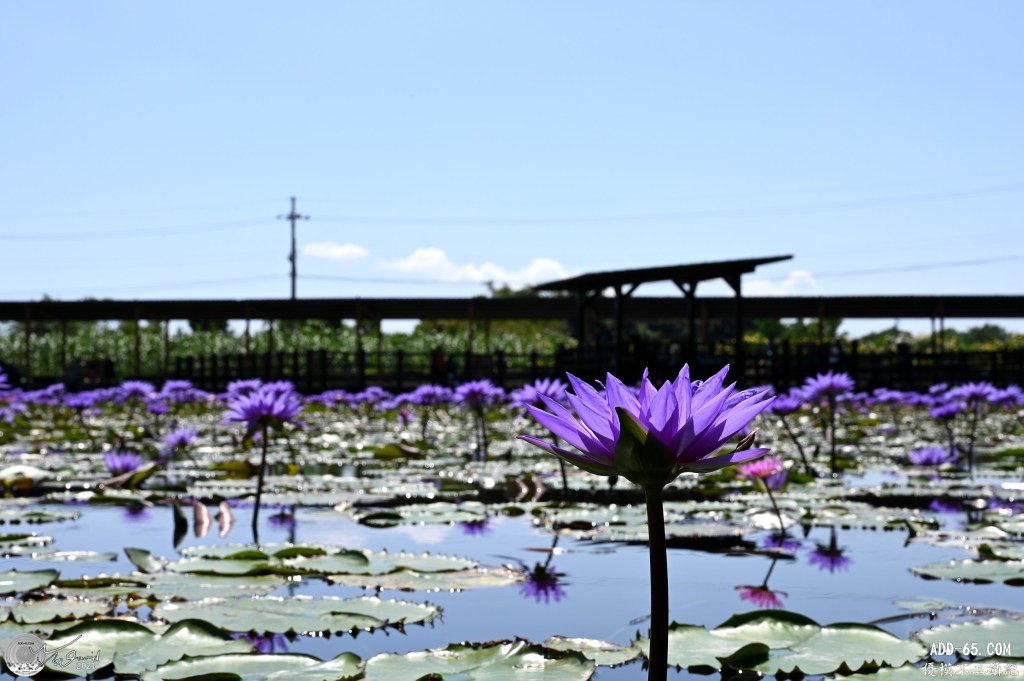 和前一篇韭菜花田的拍法一樣,找一朵花當主角,其它當背景,來個大合照吧!蹲下來在池邊這樣拍,還可以拍到花朵的倒影。