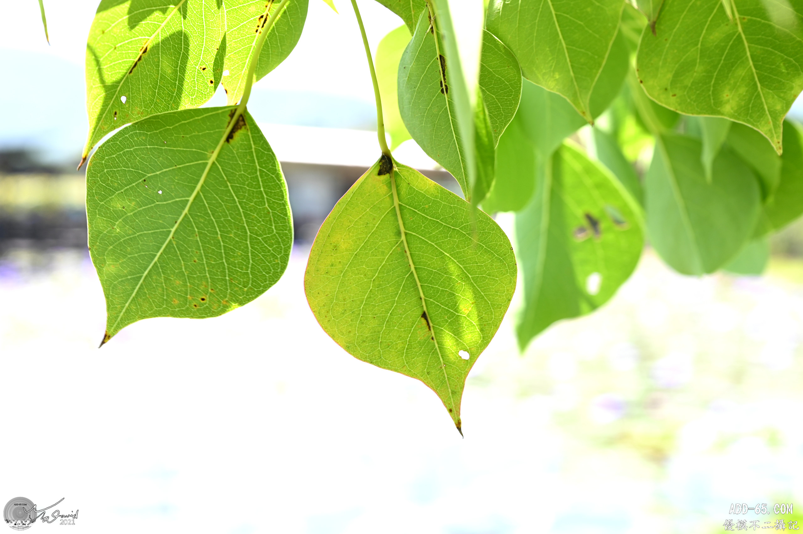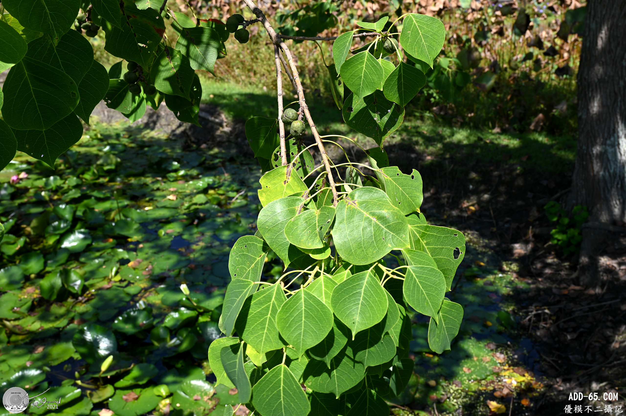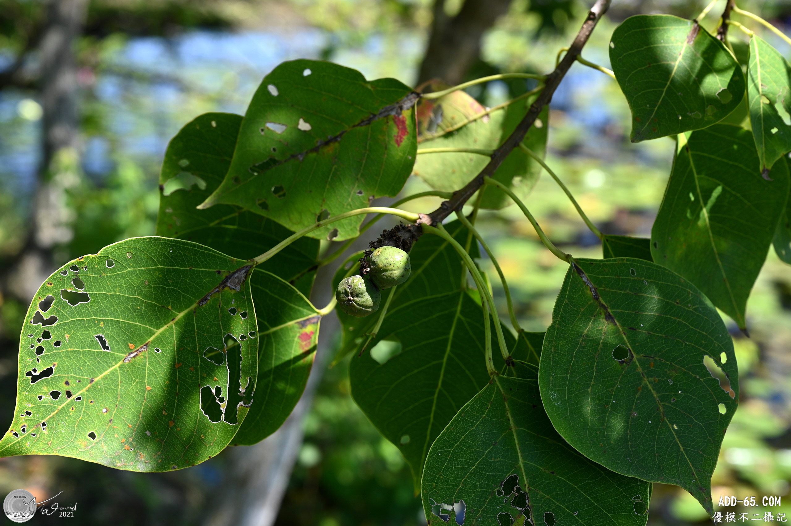 園區裡,不只種植蓮花的植物,在池邊也種了烏桕,結果初期,蒴果還是綠色,必須等到熟果期,迸開後露出種子三顆時,會有趣味性的畫面。它的葉片半透光,在逆光下拍它的葉背,非常漂亮。
