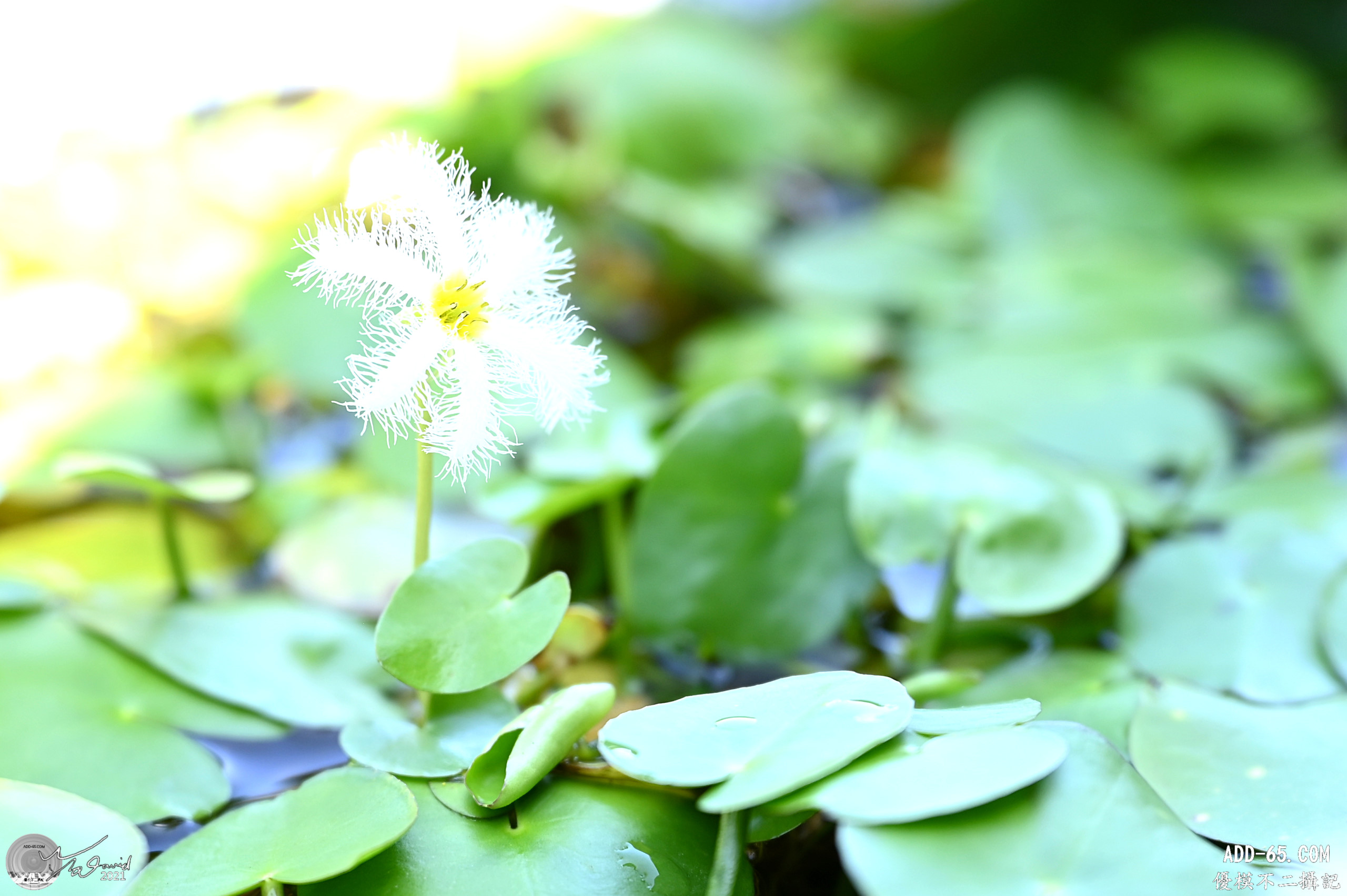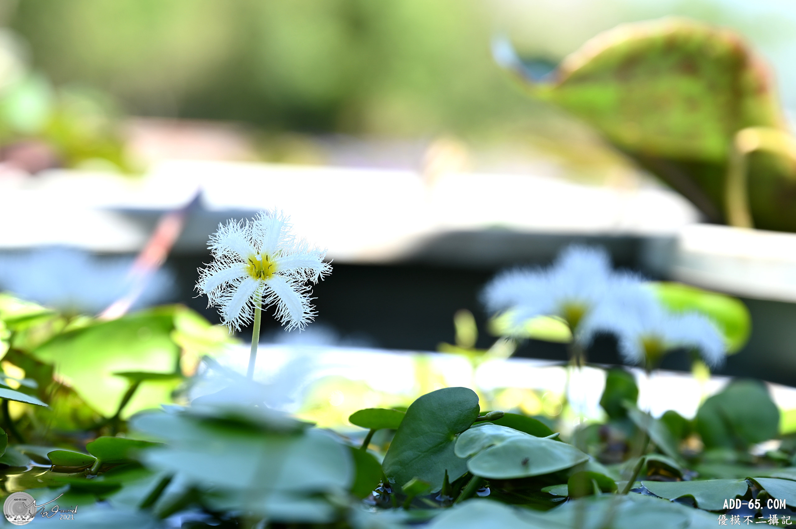 在入口處的池邊,有大水盆裁種了兩種莕菜,印度莕菜純白花冠裂片帶著長絲蕾絲般的樣態,具有華麗感,通常是種植在水盆或池塘裡。下左圖故意曝光較多,突顯花朵中間的五根花蕊,也讓白色裂瓣更加清新亮麗。