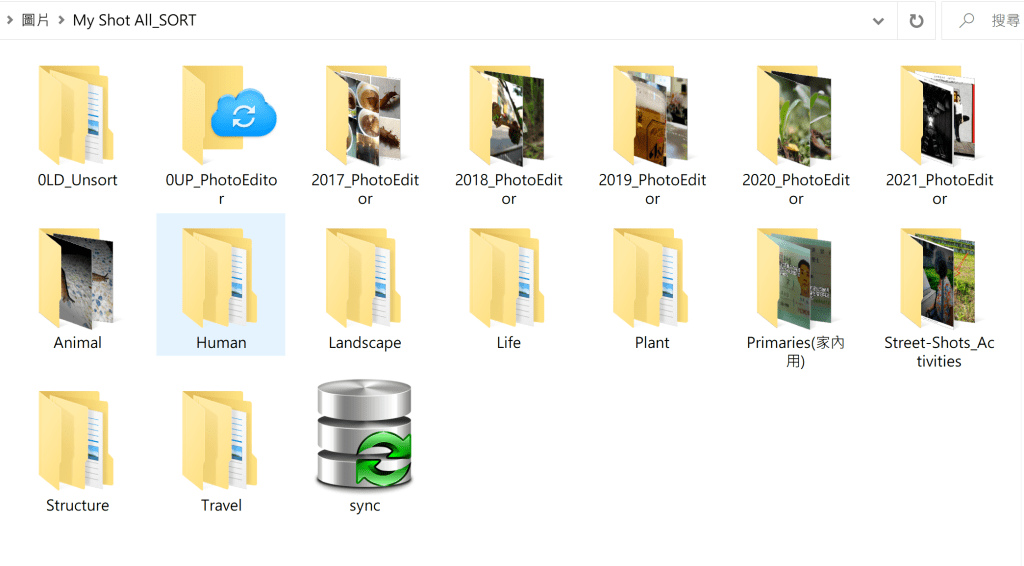 照片和影片和音樂可合稱為影音資料,如果數量不大,子類第二層只要分成照片、影片、音樂三個文件夾即可,筆者因為這類檔案數量很大,還有分成不同應用和創作等,會分得更細更多,但一般只要分成這三種就夠了。在這第二層下面,如果您還想再細分,以照片為例,筆者會採用拍攝或創作的年月份為一般分類依據,如果是專案拍攝或是外出旅遊,會用另外的一個文件夾,做為分類存放路徑。影片方面,如果您只是收集別人的影片,兼有部分是自己拍攝,就分成兩種類型存放。筆者的影片創作也不少,是採創作專案名稱或客戶對象等區別,所以,第二層的分類,得看個人的習性而定。下圖是筆者目前照片類的分類整理,早期2016以前的已經轉換成更類別存放,2017之後,還有部分未分類,暫存在各年份文件夾。最後的sync文件夾是同步備份軟體的註記,未來再介紹這個備份軟體。