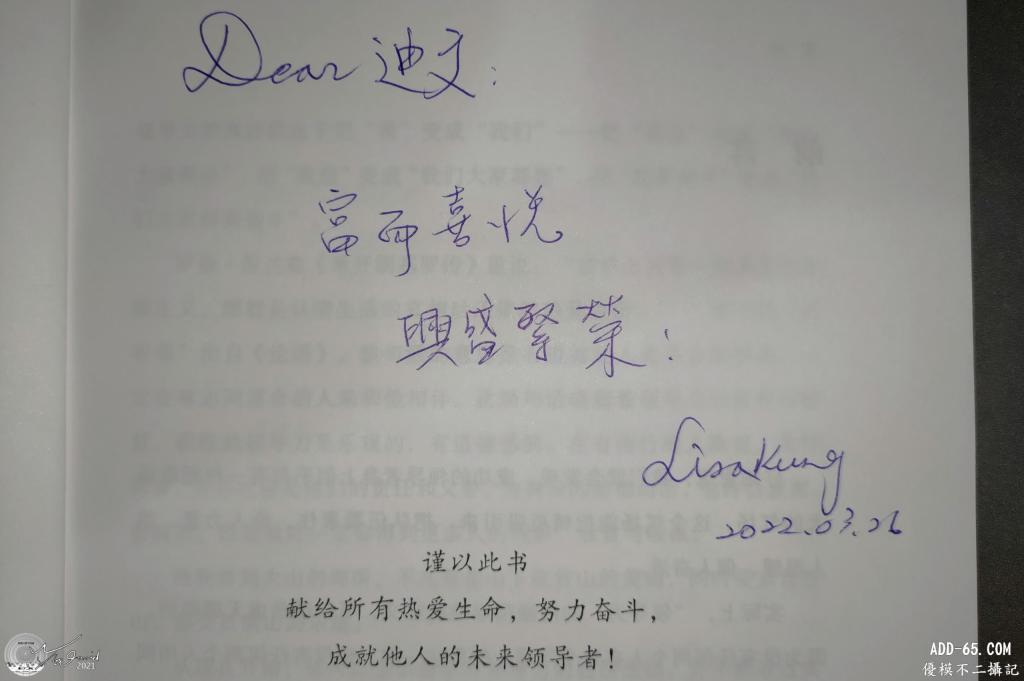 由一年多前客戶關係演變到伙伴甚至朋友的關係,一直受到龔靖淳(Lisa)老師的愛護,不只多次邀約筆者拍攝,也不斷提供滋養成長的進修資訊。這次3月底再度受邀到台南大飯店拍攝記錄USANA系統年會的點點滴滴,活動結束時,不是受訓學員的筆者,也獲得一本能力培訓的秘技書籍,內頁裡還有龔老師親筆簽名,非常感動。