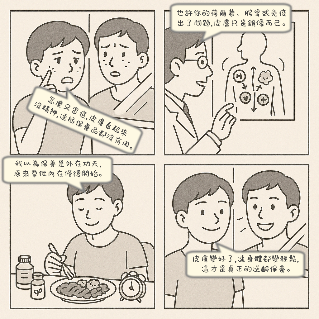 - 不要只靠保養品處理皮膚問題,要回頭看生活與飲食。
