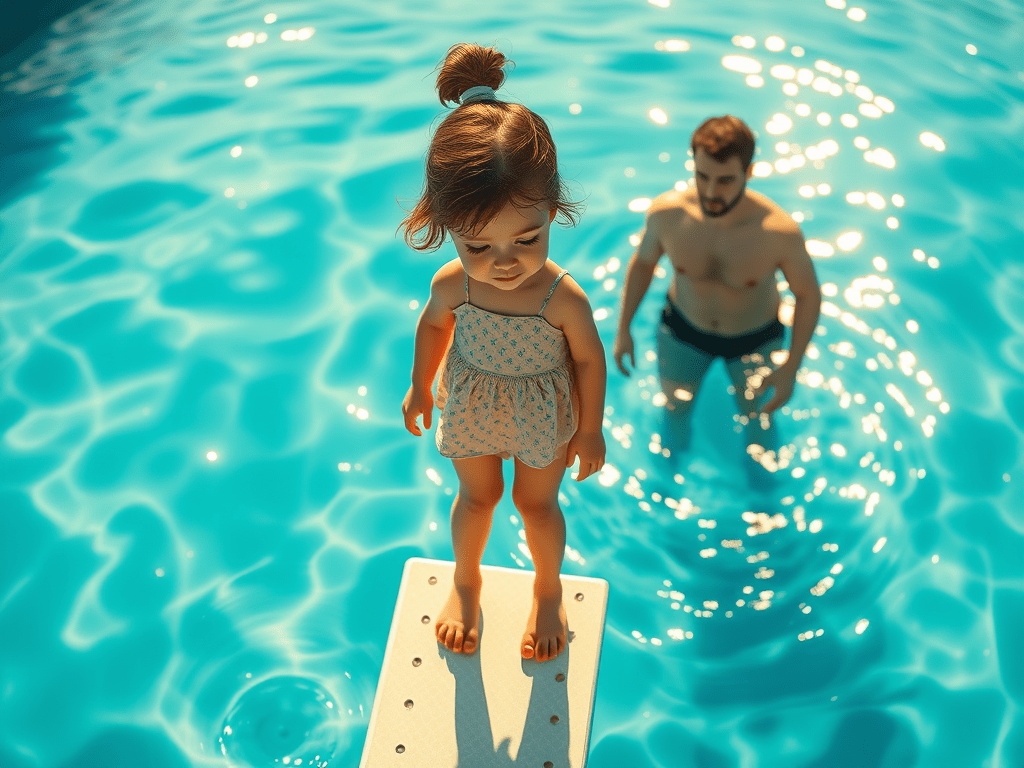泳池邊,一位小女孩站在跳台上,緊張得發抖。 爸爸站在水裡對她喊:「我在這裡,看著你!」 她閉上眼,跳了下去,浮出水面後喊著:「我做到了!」