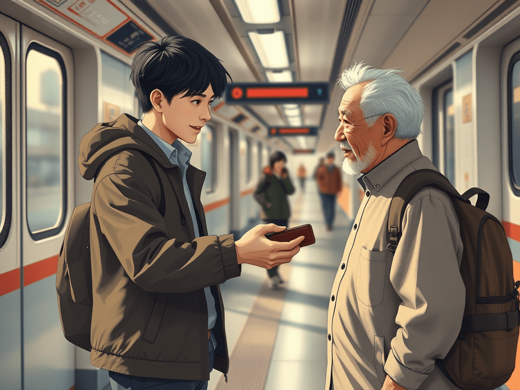 一位青年在捷運上看到一位阿伯掉了錢包,正要提醒時,旁邊的乘客小聲說:「別多管,等一下被誤會偷的就麻煩。」